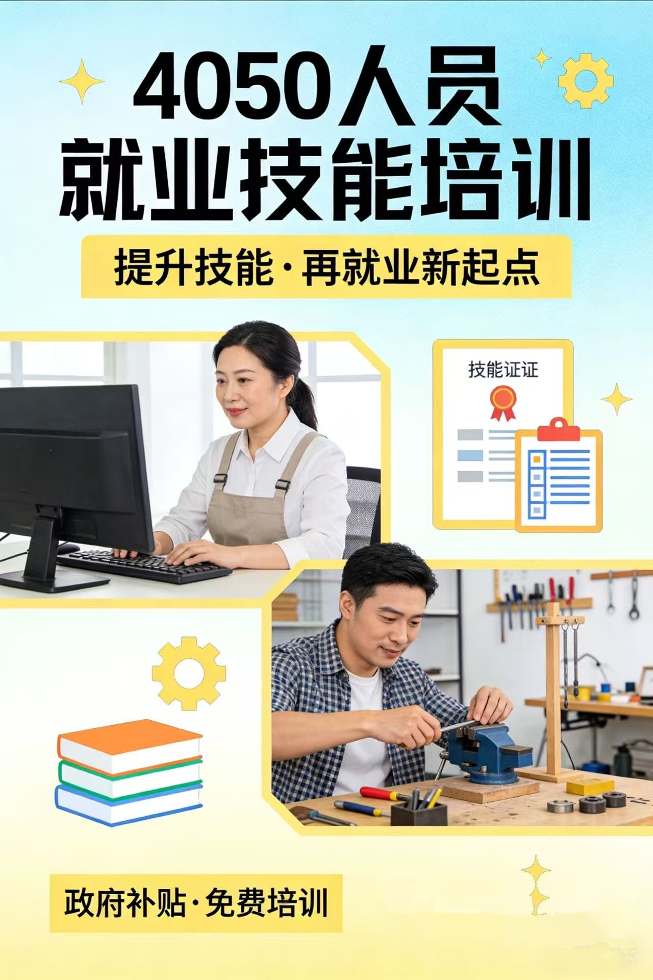 面向年满40周岁的女性、50周岁的男性就业困难人员(即“4050人员”),免费提供市场刚需的职业技能培训,考核合格后颁发相应技能结业证书,并协助对接就业岗位,全程不收取学员任何培训费用。面向年满40周岁的女性、50周岁的男性就业困难人员(即“4050人员”),免费提供市场刚需的职业技能培训,考核合格后颁发相应技能结业证书,并协助对接就业岗位,全程不收取学员任何培训费用。面向年满40周岁的女性、50周岁的男性就业困难人员(即“4050人员”),免费提供市场刚需的职业技能培训,考核合格后颁发相应技能结业证书,并协助对接就业岗位,全程不收取学员任何培训费用。精选家政服务(育婴、养老护理)、电商运营、中式面点、物业保洁等易上手、就业面广的工种,适配4050人员就业需求。